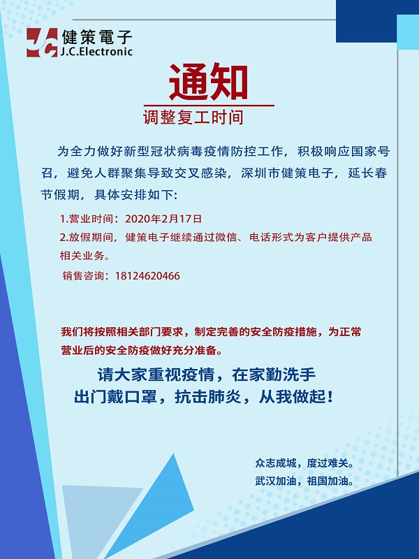 鑒于當前新型冠狀病毒肺炎疫情,為了確保您和我司同事的健康安全,我司積極響應政府號召配合疫情防控,健策全體員工于2月10日起啟動(dòng)在家辦公機制。(QQ/微信/電話(huà)隨時(shí)在線(xiàn)),正式上班日期將根據疫情情況另行通知。